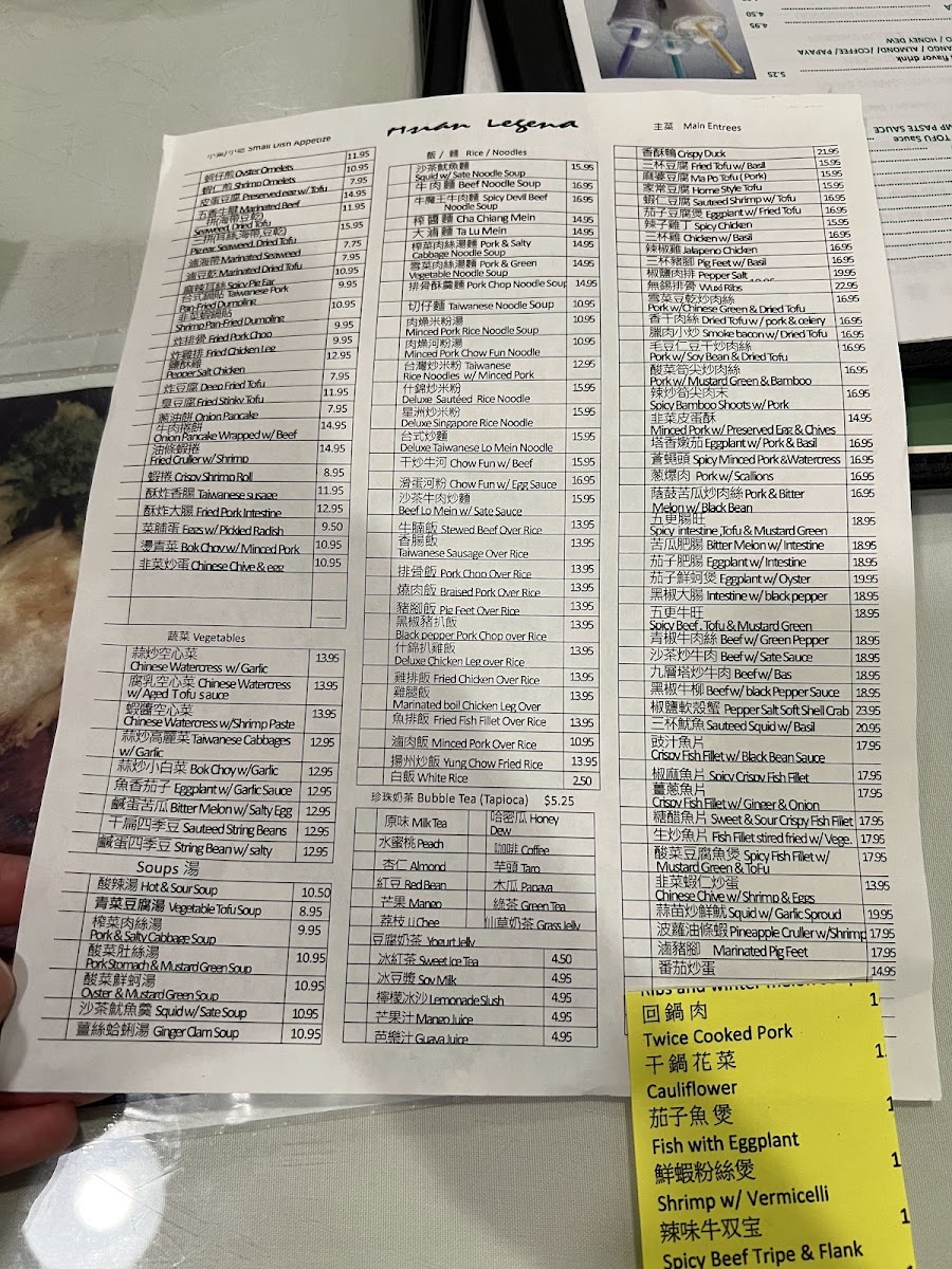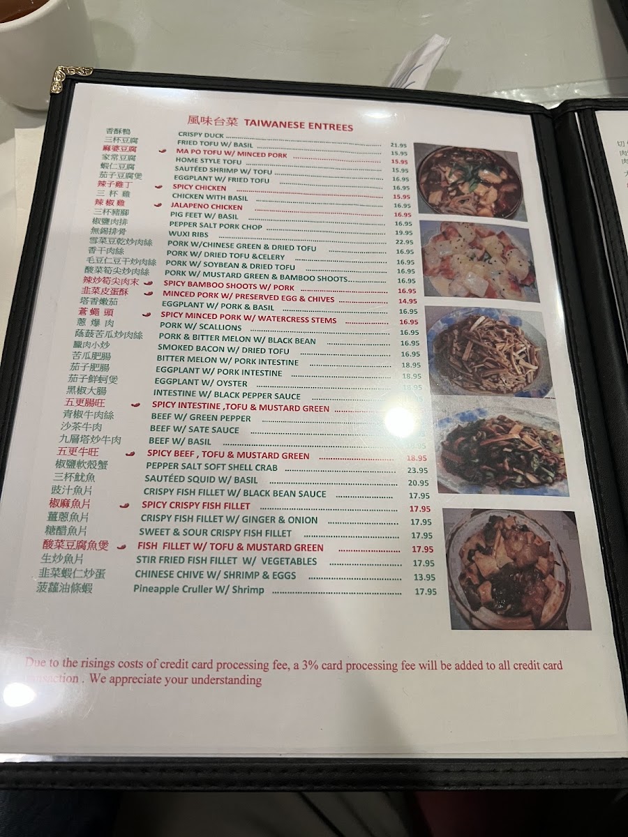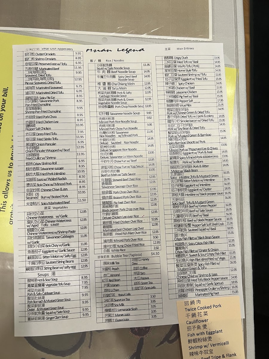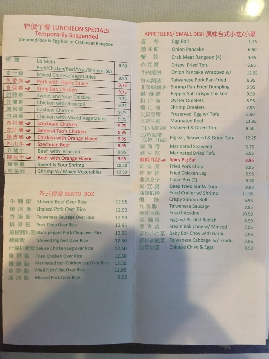 The menu at this Chinese and Pan-Asian restaurant in Ann Arbor offers a variety of dishes drawn primarily from Taiwanese and broader Chinese cuisines. It features a well-rounded selection suitable for casual dining or delivery, with options spanning appetizers, main courses, and vegetable dishes.