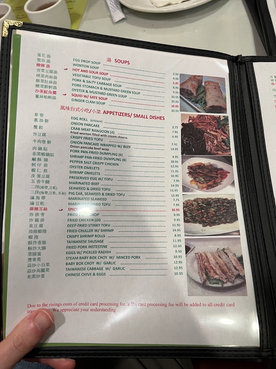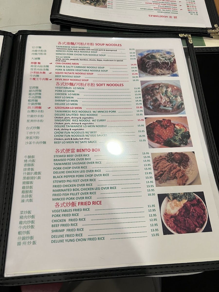 - Signature and House Specials: Items like dim sum varieties, classic dishes such as Kung Pao chicken and hot & sour soup, along with traditional Taiwanese offerings like congee and various fried rice and noodle dishes.